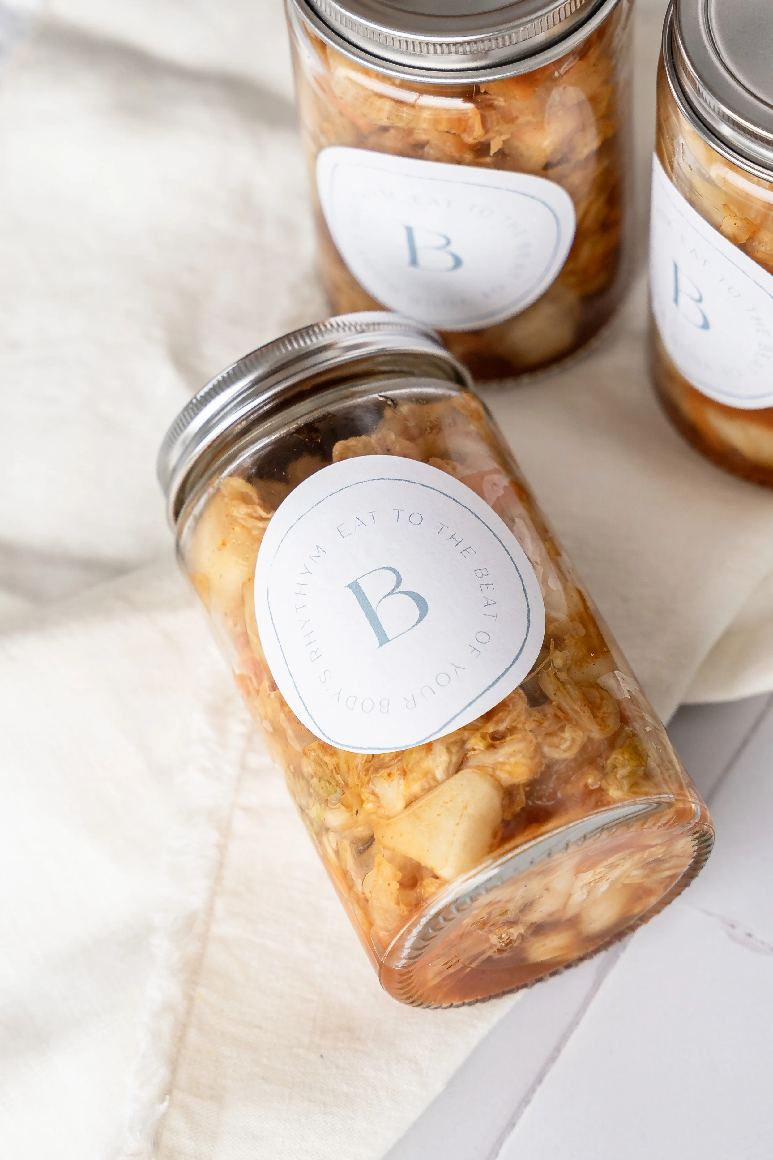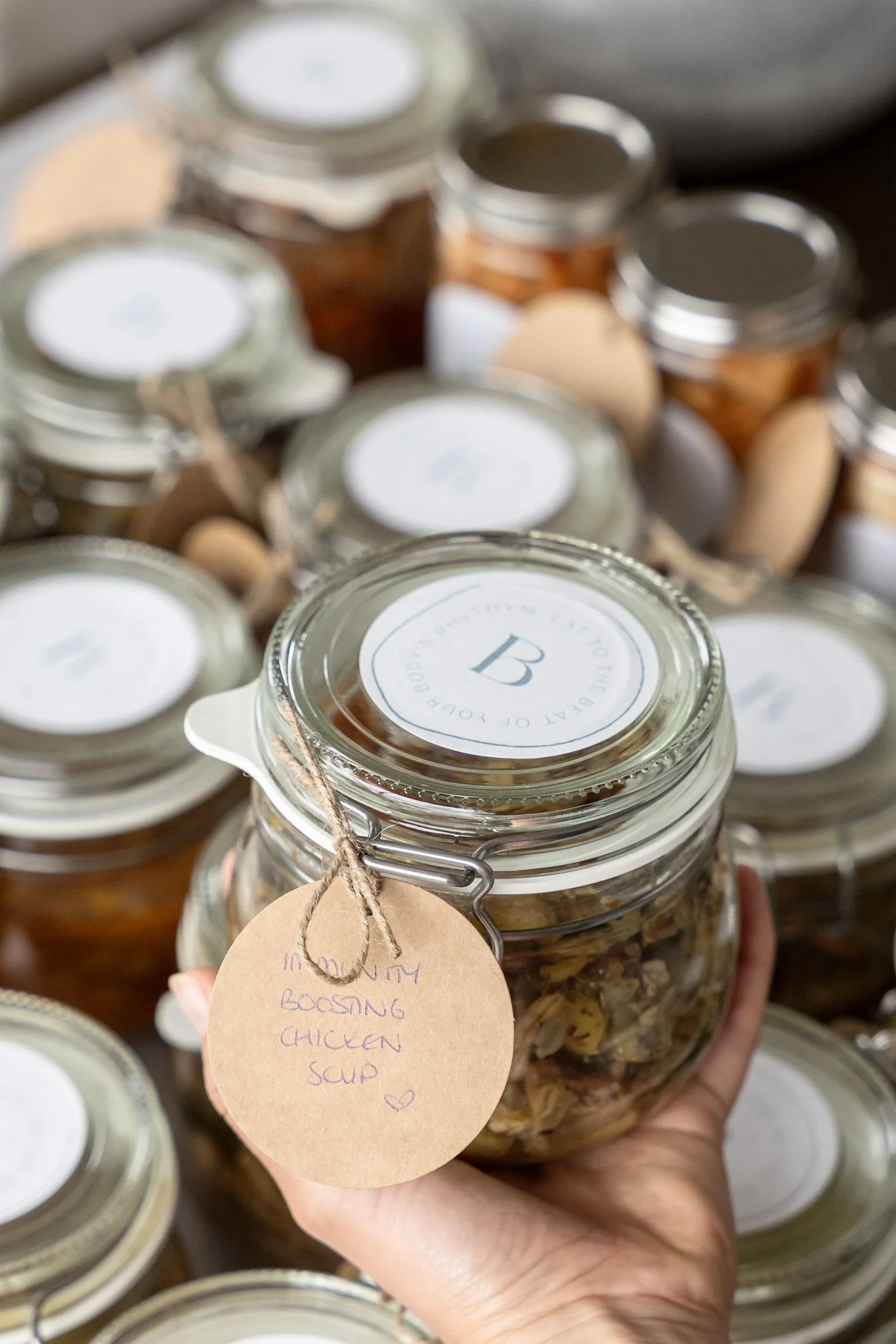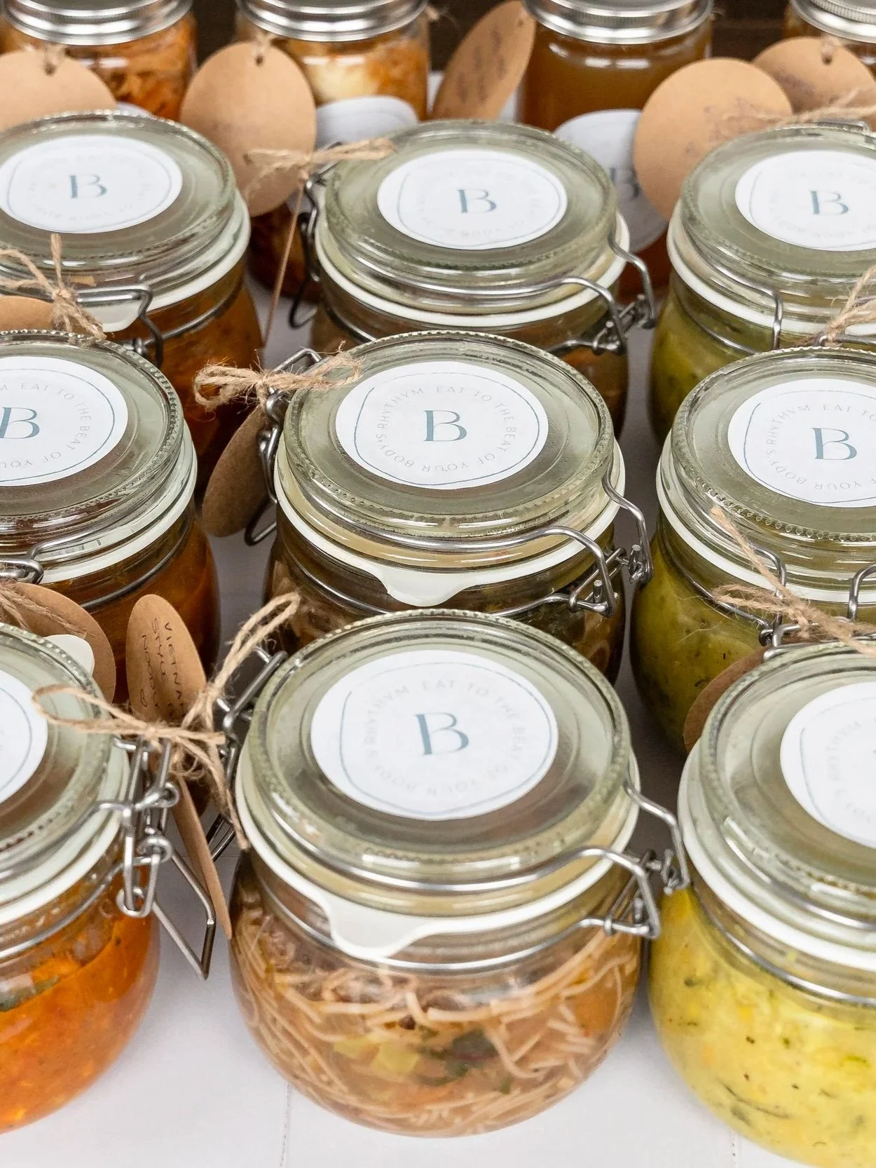 Three glass jars filled with a mixture of chopped fruit and syrup, each jar has a white label with a blue letter 'B' and the phrase 'Rhythm. Eat to the beat of your body' around it.